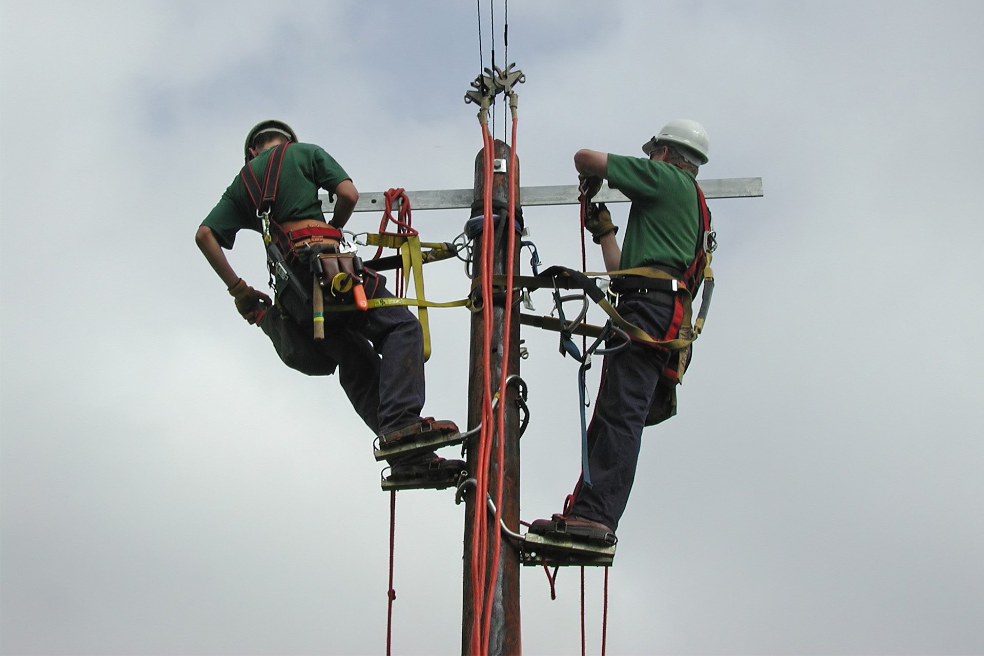 Climb School is where new hires learn how to physically do the job, including how to strap climbing hooks (gaffs) to their boots, force them into wooden poles, and climb vertically while carrying the tools and gear needed for overhead work. This movement alone places significant strain on the lower legs, hips, shoulders, and grip.